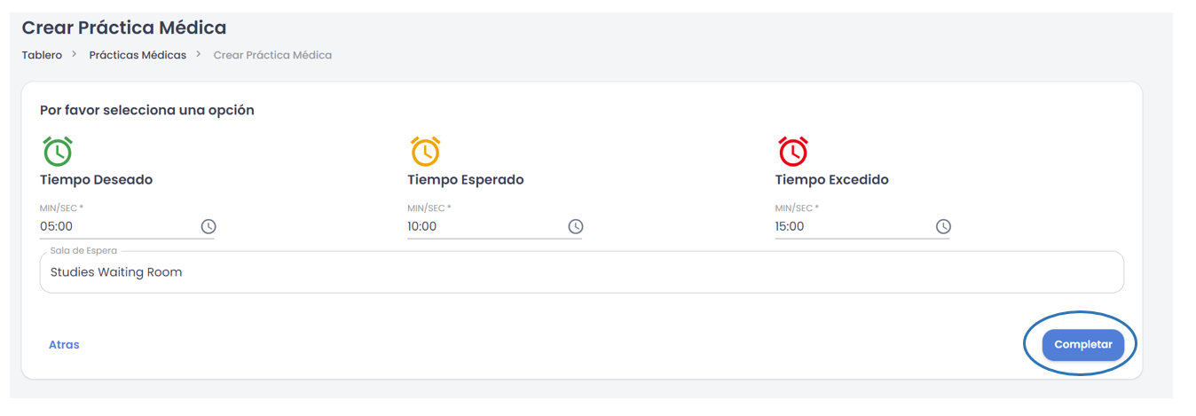 Asigna los tiempos que consideres como “deseado”, “Esperado” y “Excedido” para la realización de la Práctica Médica. Ej. Para una autorefractometría el tiempo deseado puede ser de 5 minutos, 10 minutos tiempo tolerable y más de 10 minutos se considera excedido. Luego en “Sala de Espera” selecciona la correspondiente y haz click en “Completar”.