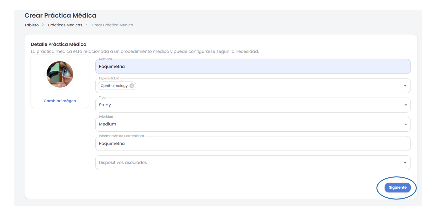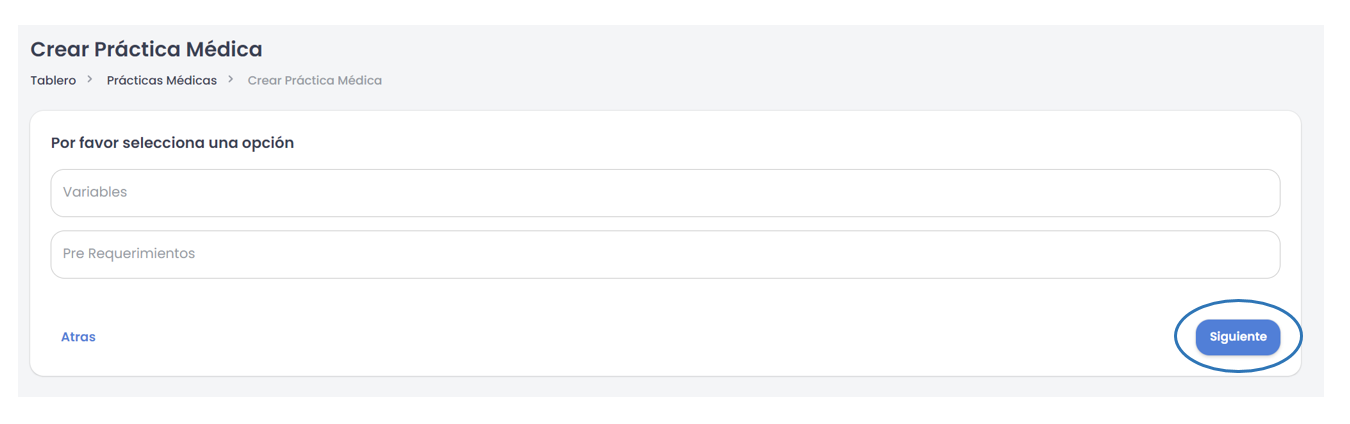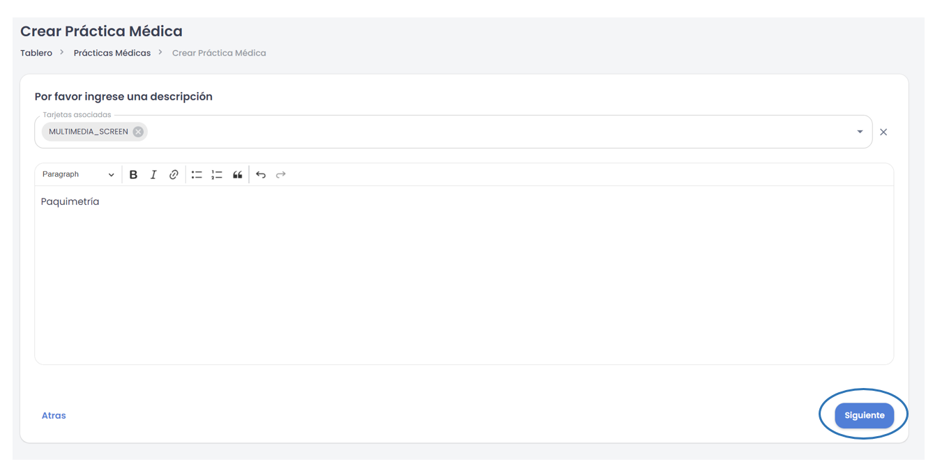 En Tarjetas Asociadas deberás seleccionar todas las “cards” que desees que formen parte de tu “Práctica médica” (ver apartado del “Contenido Cards”). Luego presiona en “Siguiente”.