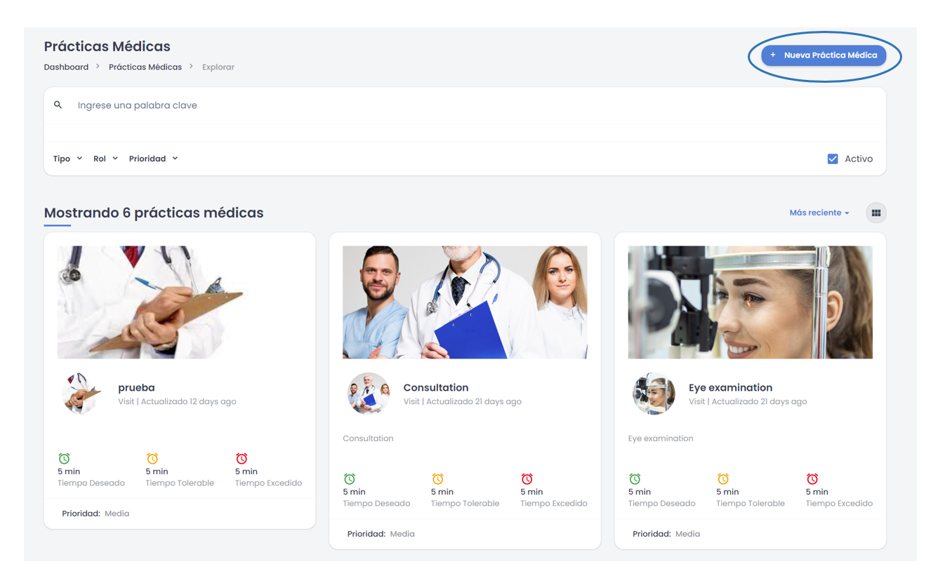Selecciona el botón que aparece arriba a la derecha de “+Nueva Práctica Médica”.