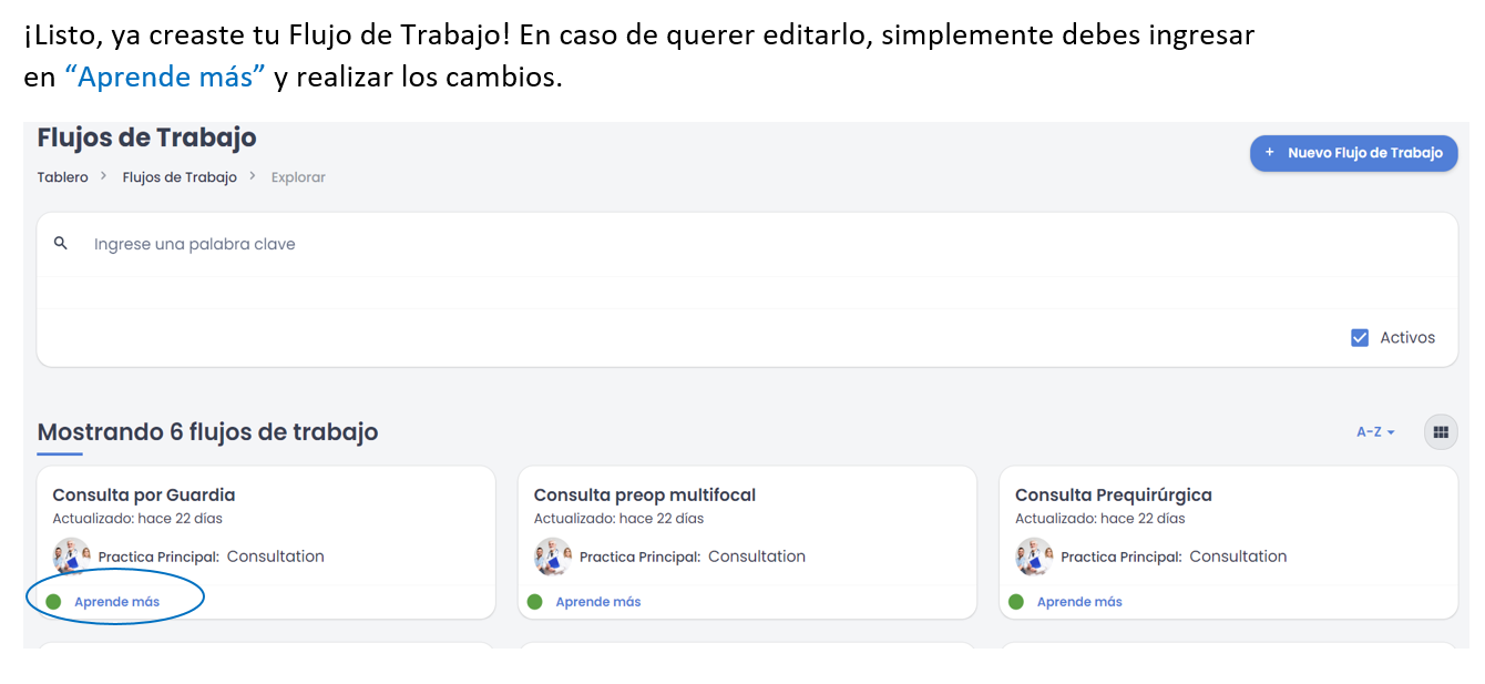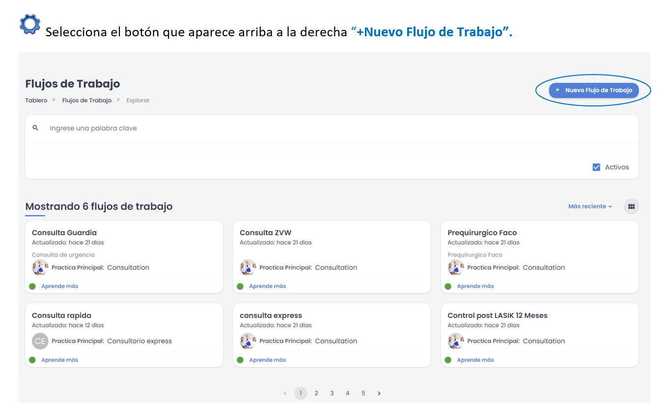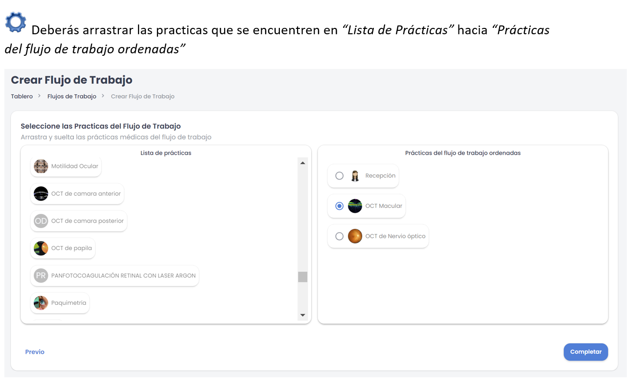 De esta manera, la clínica irá conformando cada Flujo de trabajo con las prácticas médicas que considere correspondientes.