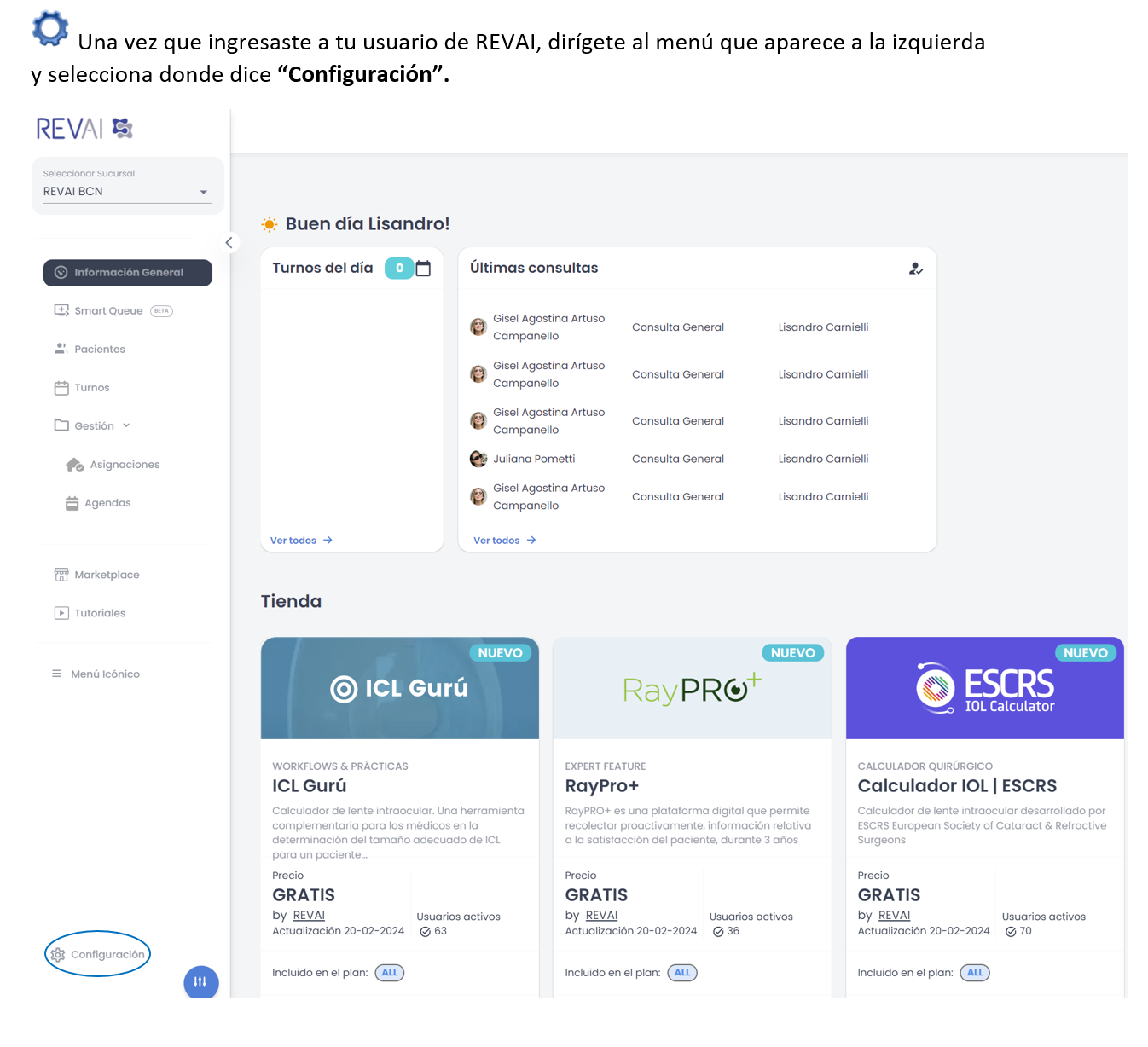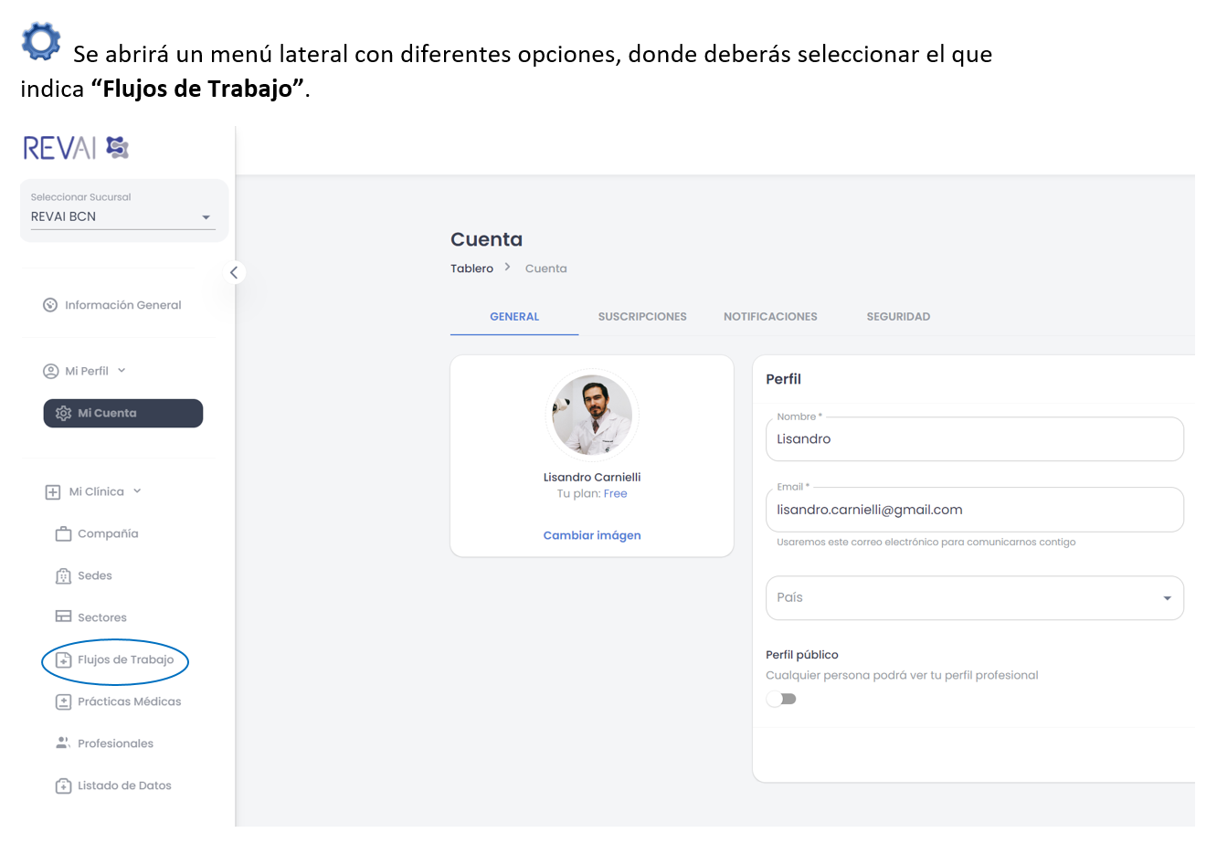 Una vez que ingresaste a tu usuario de Revai, dirígete al panel lateral izquierdo y selecciona "Configuración" . Ahora en la barra lateral se visualizarán las siguientes opciones, entre las que debes seleccionar "Profesionales". Seleccionar "+ Nuevo ...